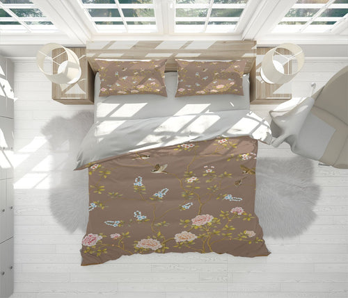 Birds Flowers Duvet Cover Set W Pillow Cover, Brown Art Chinoiserie 3D Quilt Cover, Single Double Queen King Size Doona Cover