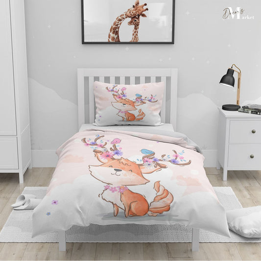Fox Bird Flower Duvet Cover Set w Pillow Cover, Pink Kids Cartoon 3D Quilt Cover, Single Double Queen King Size Doona Cover