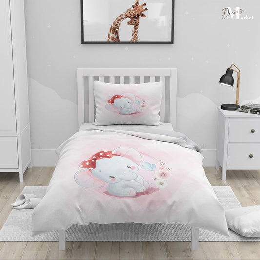 Elephant Bird Friend Duvet Cover Set w Pillow Cover, Pink Kids Cartoon 3D Quilt Cover, Single Double Queen King Size Doona Cover