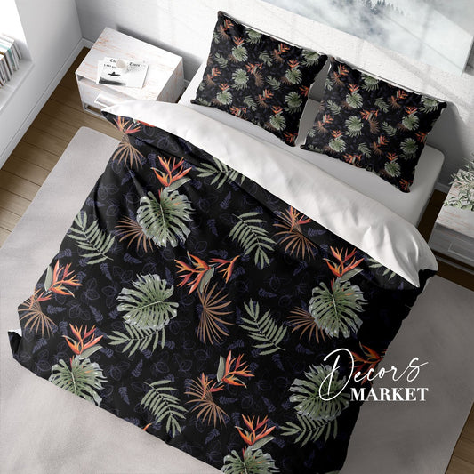 Monstera Bird Paradise Duvet Cover Set w Pillowcases, Black Floral Patterns 3D Quilt Cover, 3pc Single Double Queen King Size Doona Cover