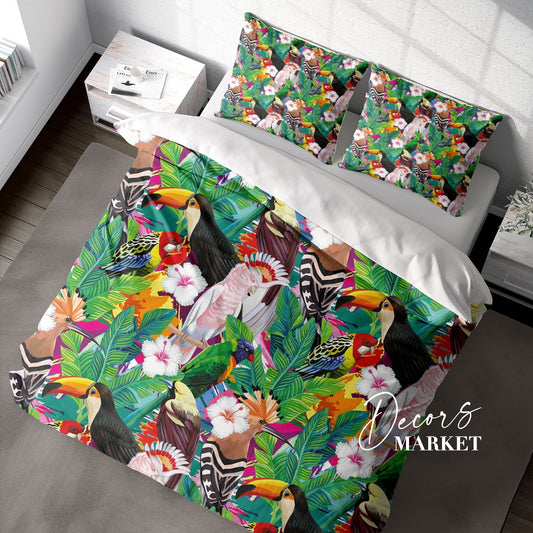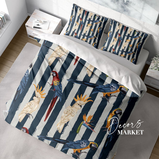 Parrots Duvet Cover Set w Pillowcases, Cockatoo Colorful Animals Birds 3D Quilt Cover, 3pc Single Double Queen King Size Doona Cover