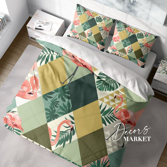 Flamingo Leaf Duvet Cover Set W Pillow Cover, Green Animals Birds 3D Quilt Cover, Single Double Queen King Size Doona Cover