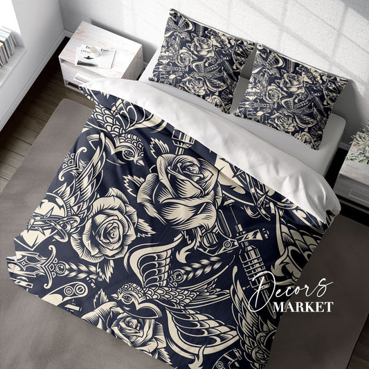 Bird Knife Rose Duvet Cover Set w Pillowcases, Black&White Art Fantasy 3D Quilt Cover, 3pc Single Double Queen King Size Doona Cover