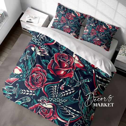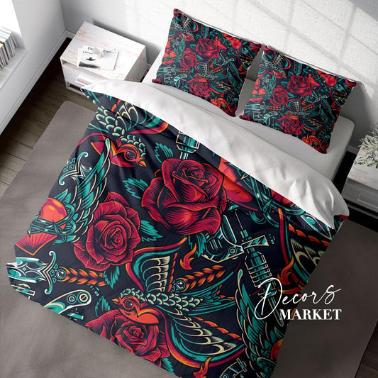 Bird Knife Rose Duvet Cover Set w Pillowcases, Colorful Art Fantasy 3D Quilt Cover, 3pc Single Double Queen King Size Doona Cover