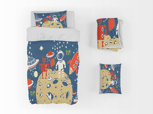 Astronaut Rocket Duvet Cover Set W Pillow Cover, Blue Kids Cartoon 3D Quilt Cover, Single Double Queen King Size Doona Cover