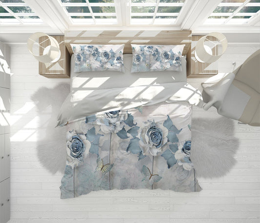 Rose Butterfly Floral Flowers Blue 3D Duvet Cover Set W Pillow Cover, Single Double Queen King Size, Printed Cotton Quilt Doona Cover 3 Pcs