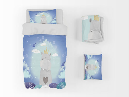 Hippopotamus Kids Cartoon Blue 3D Duvet Cover Set W Pillow Cover, Single Double Queen King Size, Printed Cotton Quilt Doona Cover 3 Pcs