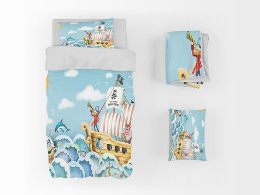 Pirate Ship Kids Cartoon Blue 3D Duvet Cover Set W Pillow Cover, Single Double Queen King Size, Printed Cotton Quilt Doona Cover 3 Pcs