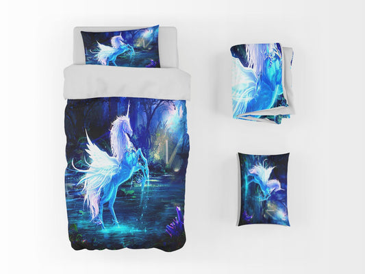 Unicorn Aurora Duvet Cover Set W Pillow Cover, Blue Animals Fantasy Animals 3D Quilt Cover, Single Double Queen King Size Doona Cover