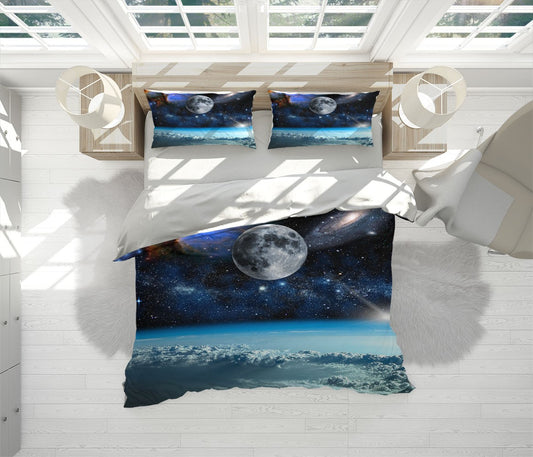 Earth Moon Duvet Cover Set W Pillow Cover, Blue Nature Sky 3D Quilt Cover, Single Double Queen King Size Doona Cover