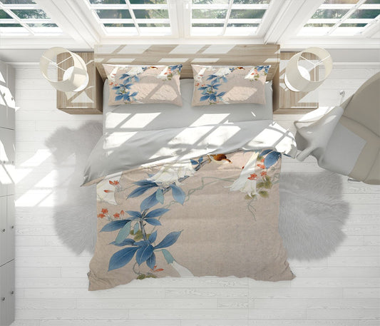 Blue Flower Duvet Cover Set W Pillow Cover, Brown Art Chinoiserie 3D Quilt Cover, Single Double Queen King Size Doona Cover