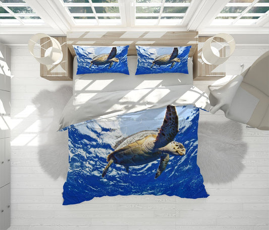 Sea Turtle Animals Sea Life Blue 3D Duvet Cover Set W Pillow Cover, Single Double Queen King Size, Printed Cotton Quilt Doona Cover 3 Pcs