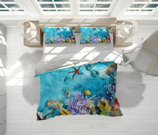 Starfish Coral Duvet Cover Set W Pillow Cover, Blue Nature Underwater 3D Quilt Cover, Single Double Queen King Size Doona Cover