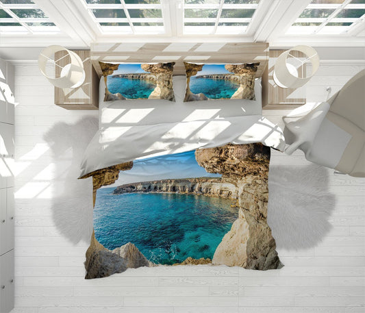 Sea Cave Duvet Cover Set W Pillow Cover, Blue Nature Landscape 3D Quilt Cover, Single Double Queen King Size Doona Cover