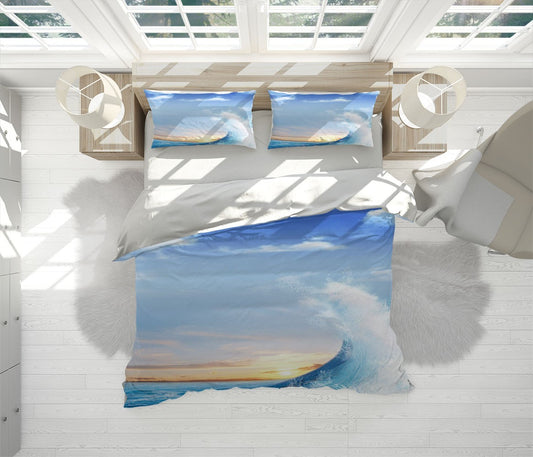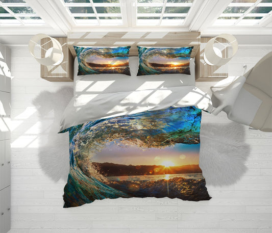 Big Wave Sunset Duvet Cover Set W Pillow Cover, Blue Beach Wave 3D Quilt Cover, Single Double Queen King Size Doona Cover