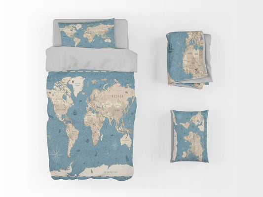 Vintage Ocean Duvet Cover Set W Pillow Cover, Blue Kids Kids Map 3D Quilt Cover, Single Double Queen King Size Doona Cover