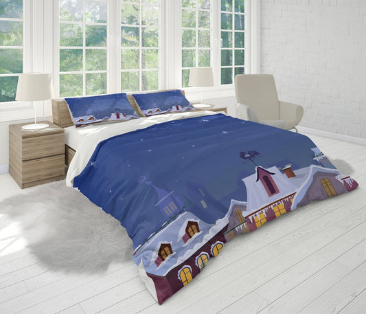 Night Village Art Traditional Blue 3D Duvet Cover Set W Pillow Cover, Single Double Queen King Size, Printed Cotton Quilt Doona Cover 3 Pcs