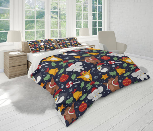 Santa Christmas Tree Snowman Duvet Cover Set W Pillowcases, Blue Kids Patterns 3D Quilt Cover, 3Pc Single Double Queen King Size Doona Cover