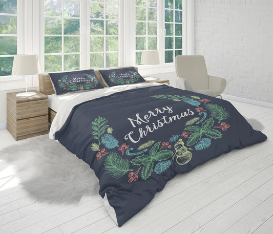 Xmas Mistletoe Duvet Cover Set W Pillowcases, Blue Floral Leaves 3D Quilt Cover, 3Pc Single Double Queen King Size Doona Cover