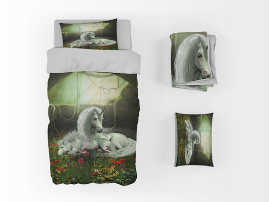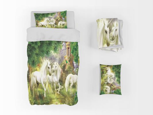 Unicorn Kids Fantasy Green 3D Duvet Cover Set W Pillow Cover, Single Double Queen King Size, Printed Cotton Quilt Doona Cover 3 Pcs