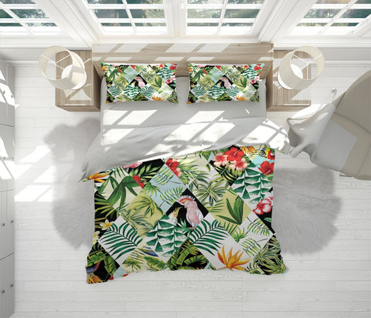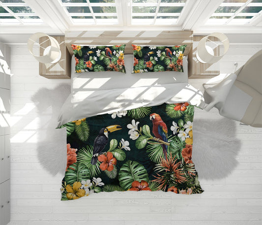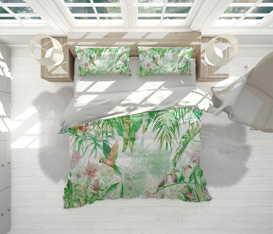 Tropical Parrot Duvet Cover Set W Pillow Cover, Green Floral Patterns 3D Quilt Cover, Single Double Queen King Size Doona Cover