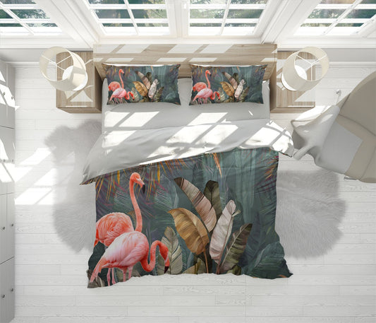Flamingo Leaf Duvet Cover Set W Pillow Cover, Green Animals Birds 3D Quilt Cover, Single Double Queen King Size Doona Cover
