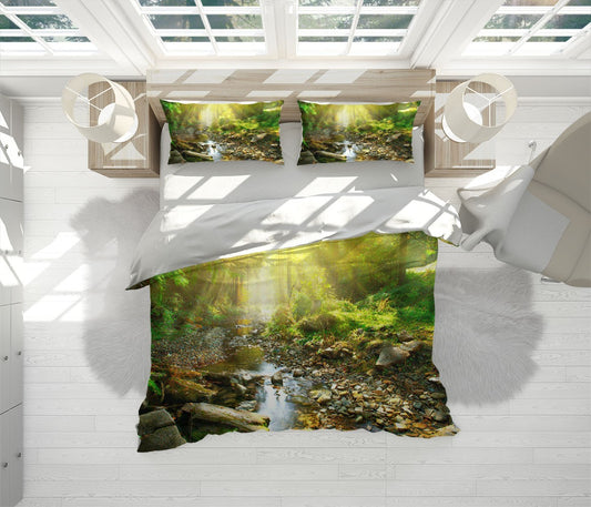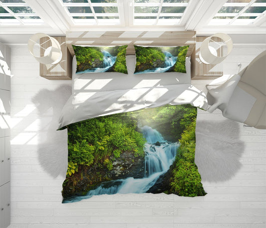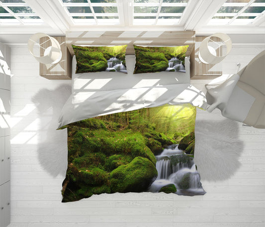 Creek Waterfall Nature Green 3D Duvet Cover Set W Pillow Cover, Single Double Queen King Size, Printed Cotton Quilt Doona Cover 3 Pcs