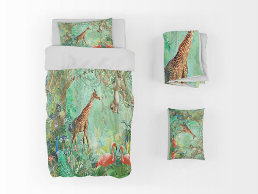 Giraffe Flamingo Kids Animal Green 3D Duvet Cover Set W Pillow Cover, Single Double Queen King Size, Printed Cotton Quilt Doona Cover 3 Pcs