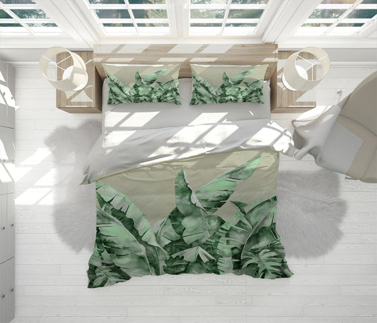 Tropical Leaves Floral Green 3D Duvet Cover Set W Pillow Cover, Single Double Queen King Size, Printed Cotton Quilt Doona Cover 3 Pcs