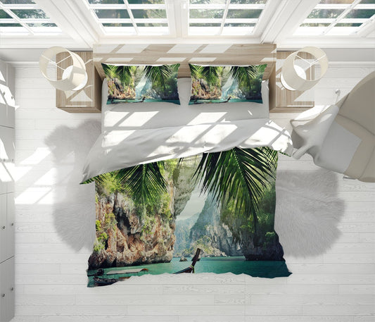 Sailboat Island Duvet Cover Set W Pillow Cover, Green Beach Seas & Oceans 3D Quilt Cover, Single Double Queen King Size Doona Cover