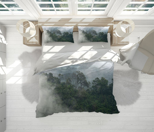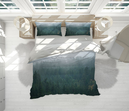 Tree Fog Duvet Cover Set W Pillow Cover, Green Nature Mountain 3D Quilt Cover, Single Double Queen King Size Doona Cover