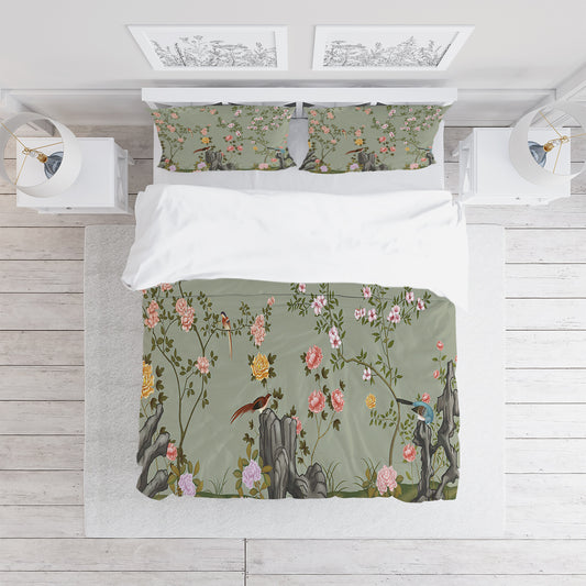 Japanese Bird Duvet Cover Set W Pillow Cover, Green Art Chinoiserie 3D Quilt Cover, Single Double Queen King Size Doona Cover