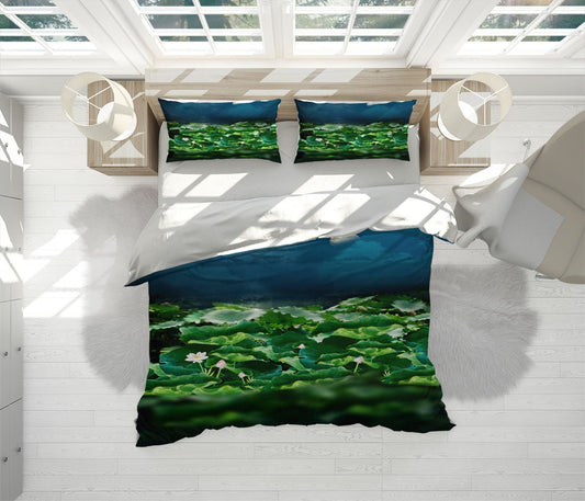 Lotus Moon Duvet Cover Set W Pillow Cover, Green Nature Natural Phenomenon 3D Quilt Cover, Single Double Queen King Size Doona Cover