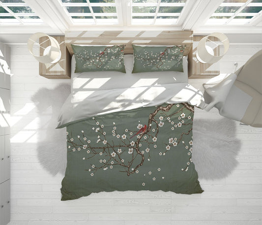 Blooming Plum Duvet Cover Set W Pillow Cover, Green Art Chinoiserie 3D Quilt Cover, Single Double Queen King Size Doona Cover