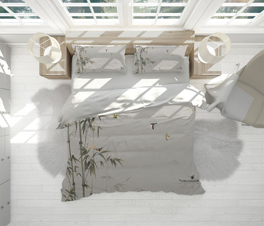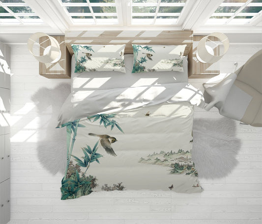 Bamboo Bird Duvet Cover Set W Pillow Cover, Green Art Chinoiserie 3D Quilt Cover, Single Double Queen King Size Doona Cover