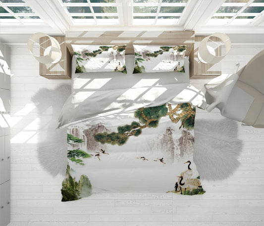 Pines Crane Duvet Cover Set W Pillow Cover, Green Art Chinoiserie 3D Quilt Cover, Single Double Queen King Size Doona Cover