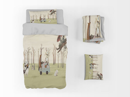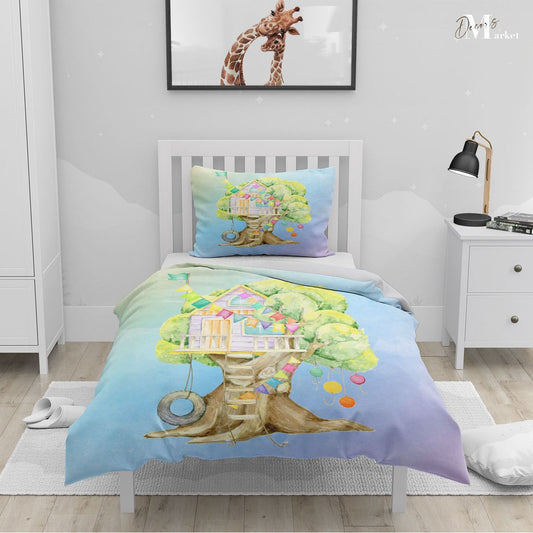 Tree House Bunting Duvet Cover Set w Pillow Cover, Green Kids Cartoon 3D Quilt Cover, Single Double Queen King Size Doona Cover