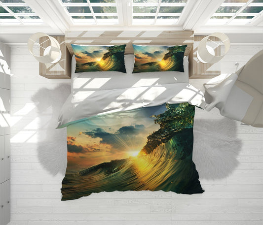 Sunset Cloud Duvet Cover Set W Pillow Cover, Green Beach Wave 3D Quilt Cover, Single Double Queen King Size Doona Cover