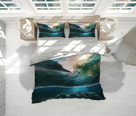 Sea Turtle Duvet Cover Set W Pillow Cover, Green Beach Seas & Oceans 3D Quilt Cover, Single Double Queen King Size Doona Cover