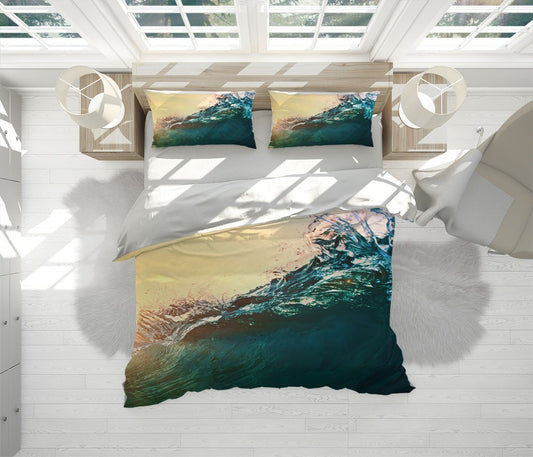 Splash Surge Duvet Cover Set W Pillow Cover, Green Beach Wave 3D Quilt Cover, Single Double Queen King Size Doona Cover