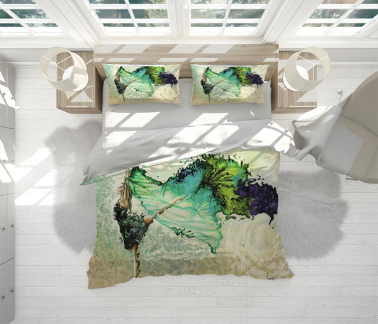 Female Dancer Duvet Cover Set W Pillow Cover, Green Art Watercolor 3D Quilt Cover, Single Double Queen King Size Doona Cover