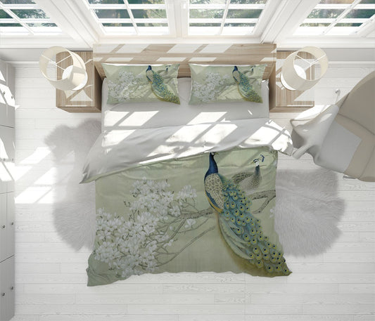 Peacock Sakura Duvet Cover Set W Pillow Cover, Green Art Traditional 3D Quilt Cover, Single Double Queen King Size Doona Cover