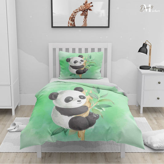 Baby Panda Nursery Duvet Cover Set w Pillow Cover, Green Art Watercolor 3D Quilt Cover, Single Double Queen King Size Doona Cover