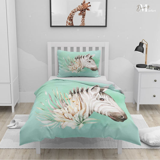 Zebra Flower Duvet Cover Set w Pillow Cover, Green Art Watercolor 3D Quilt Cover, Single Double Queen King Size Doona Cover
