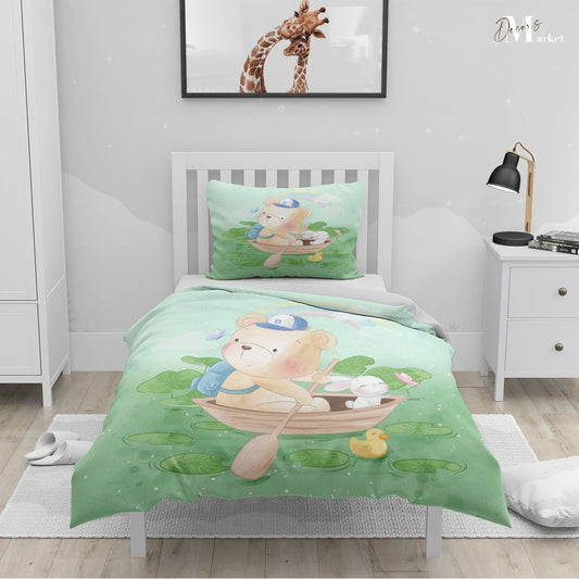 Rowing Bear Rabbit Duvet Cover Set w Pillow Cover, Green Art Watercolor 3D Quilt Cover, Single Double Queen King Size Doona Cover