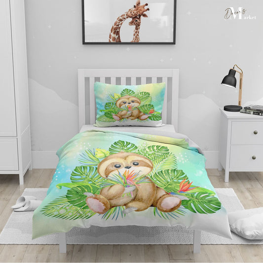 Jungle Sloth Baby Duvet Cover Set w Pillow Cover, Green Kids Animal 3D Quilt Cover, Single Double Queen King Size Doona Cover