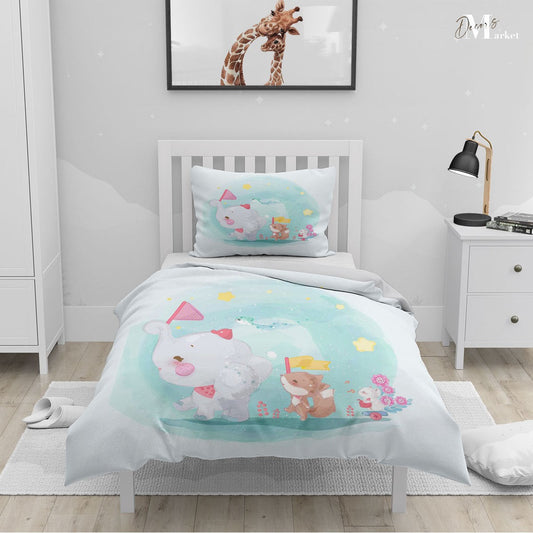 Elephant Play Friends Duvet Cover Set w Pillow Cover, Green Kids Cartoon 3D Quilt Cover, Single Double Queen King Size Doona Cover