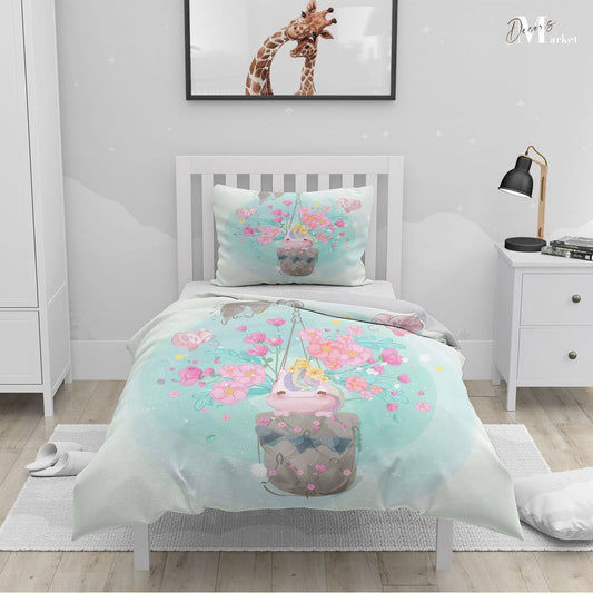 Unicorn Sleep Dream Duvet Cover Set w Pillow Cover, Green Kids Cartoon 3D Quilt Cover, Single Double Queen King Size Doona Cover