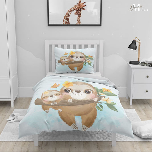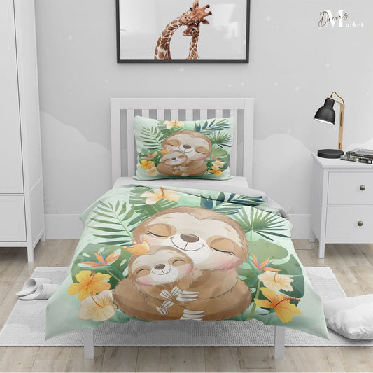 Jungle Sloth Family Duvet Cover Set w Pillow Cover, Green Kids Animal 3D Quilt Cover, Single Double Queen King Size Doona Cover