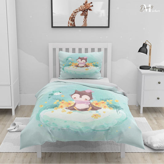 Clouds Cute Owl Duvet Cover Set w Pillow Cover, Green Kids Animal 3D Quilt Cover, Single Double Queen King Size Doona Cover